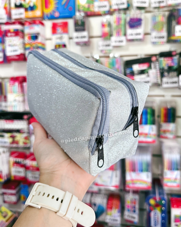 Cartuchera doble cierre gris glitter